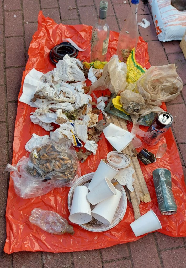 20 Zigarettenschachteln, 40 Glasflaschen, ein Dutzend Hundekotbeutel, Kaffeebecher, Feuerzeuge, Plastikpflanzen, 16 Masken (die meisten davon auf dem Gehweg) uvm.